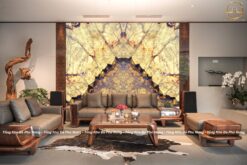 Với hình ảnh tranh ghép 2 tấm đối xứng vân phía trên, ta sẽ có được mẫu tranh trang trí phòng khách đẹp nổi bật dưới đây. Tranh đá tự nhiên onyx hồng ngọc thường được sử dụng ở khu vực tiếp khách, ốp vách tivi phòng khách, sảnh chờ, chiếu nghỉ, văn phòng làm việc,… giúp nâng tầm đẳng cấp không gian nội thất.