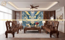 Đặc biệt, khi được lắp đèn chiếu sáng ở phía sau, bức tranh khi xuyên sáng sẽ tạo hiệu ứng ánh sáng độc đáo, cực kỳ cuốn hút, giúp gia tăng vẻ đẹp sang trọng và đẳng cấp cho không gian nội thất. Như hình ảnh minh họa dưới đây, tone màu xanh của đá và tone vàng ấm của đèn xuyên sáng tạo nên một bức tranh đẹp tuyệt vời.