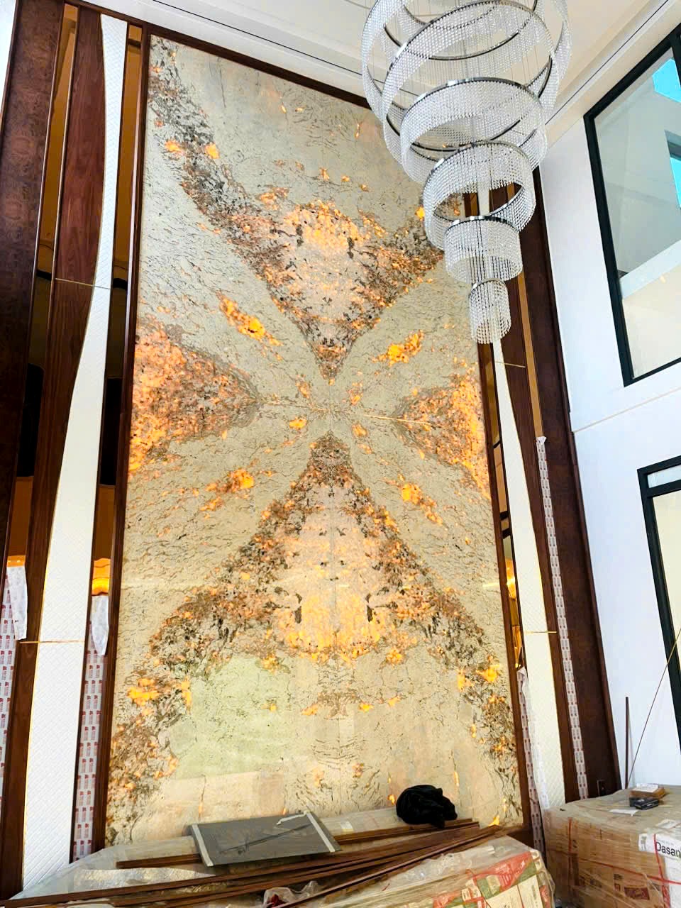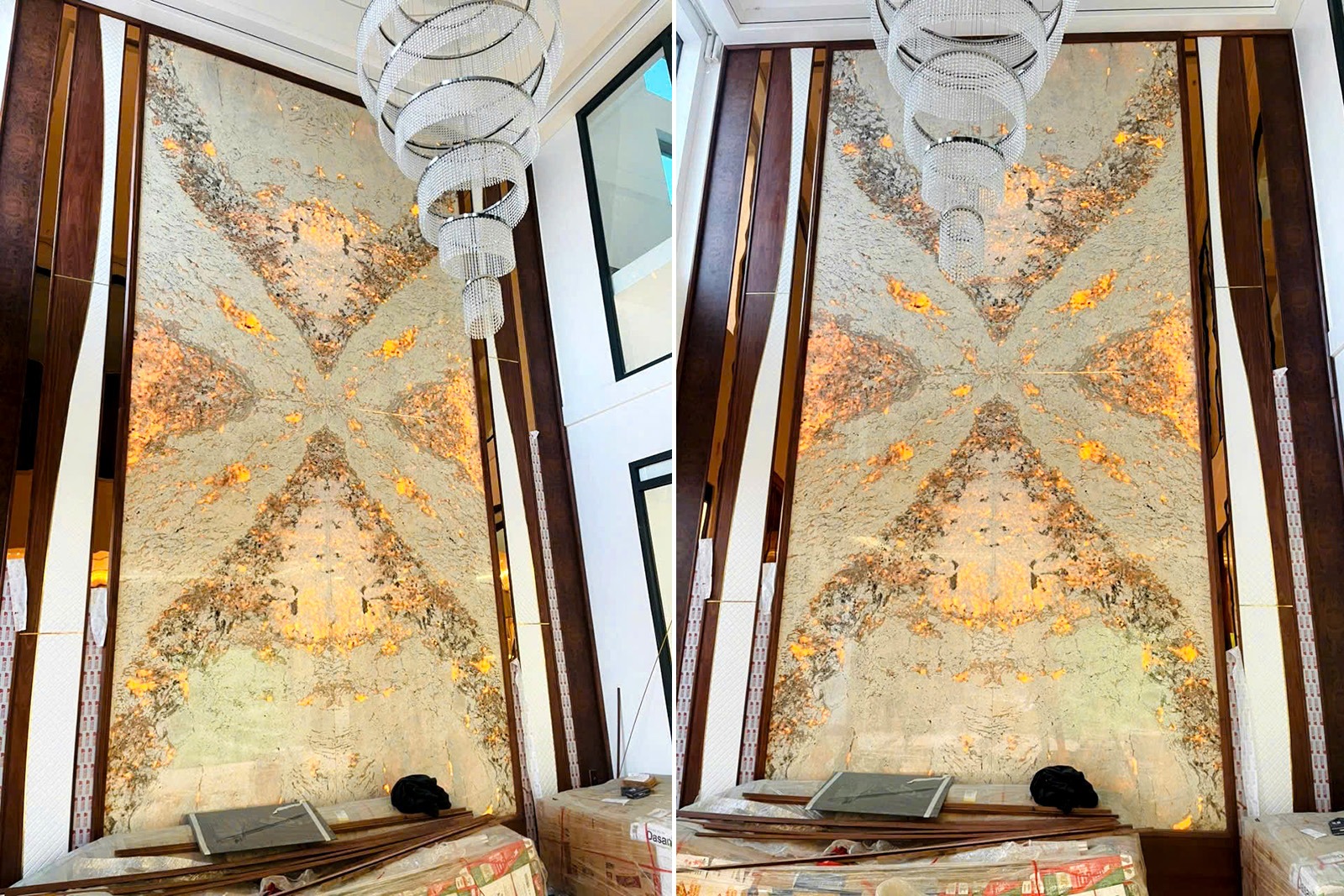 Phương án tranh đá thông tầng 4 tấm Monalisa được thi công với kỹ thuật ghép vân chuẩn xác, tạo sự liền mạch và cân đối cho toàn bộ bề mặt tranh. Khi hoàn thiện, bức tranh đá trở thành điểm nhấn thị giác ấn tượng, thu hút ánh nhìn từ nhiều góc độ khác nhau trong không gian thông tầng. Bề mặt đá được xử lý đánh bóng kỹ lưỡng, giúp phản sáng nhẹ, tăng chiều sâu và tôn lên vẻ đẹp tự nhiên của từng đường vân đá.