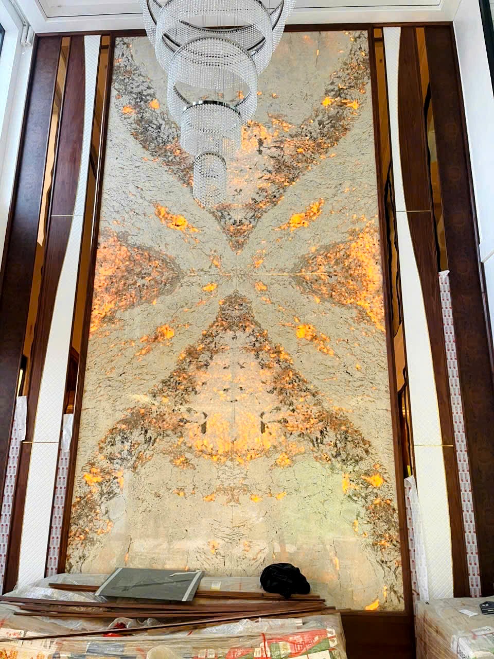 - Khả năng xuyên sáng: Đá Monalisa có thể xuyên sáng nghĩa là cho phép ánh sáng đi xuyên qua bề mặt tấm đá tạo hiệu ứng ánh sáng đẹp độc đáo ứng dụng làm tranh đá xuyên sáng hoặc các hạng mục decor trang trí.