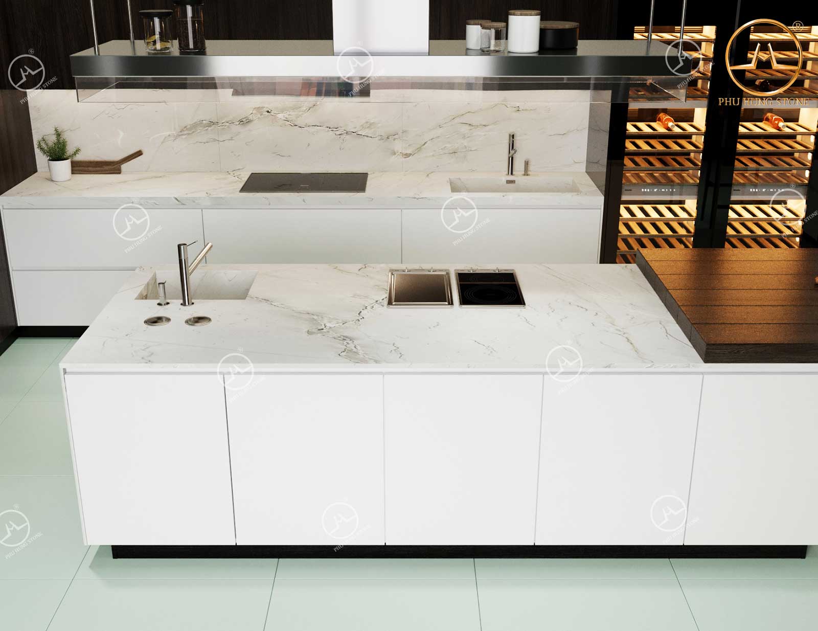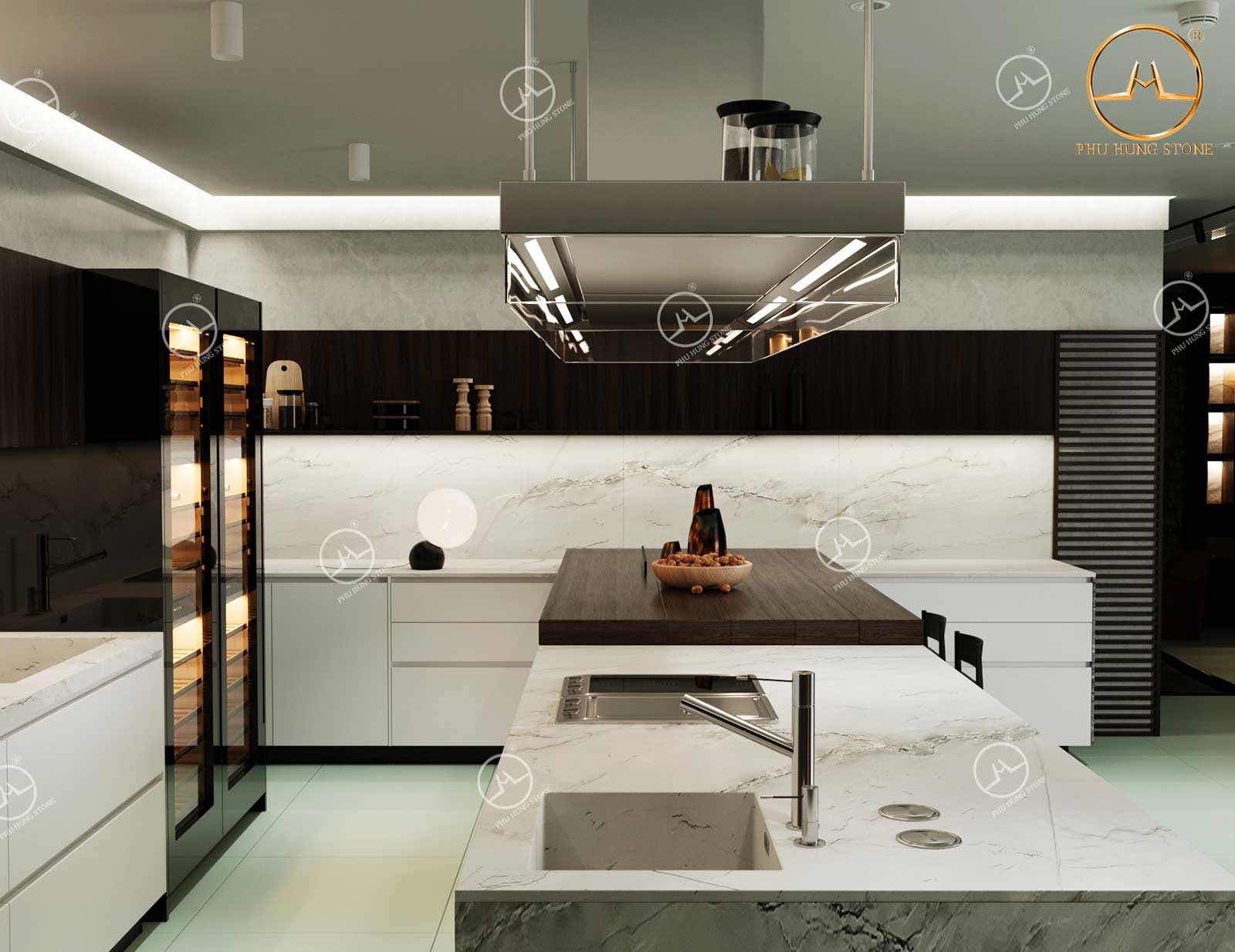 +/ Đá thạch anh trắng làm mặt bếp, ốp bếp: Các mẫu đá quartz trắng rất được yêu thích và ưa chuộng để làm đá ốp bếp khu vực tường bếp, mặt bếp với khả năng chịu lực cao, chống thấm tốt, chịu nhiệt tốt, chống bám bẩn và dễ vệ sinh. Tone màu trắng sữa, trắng ngà, trắng xám,… mang vẻ đẹp sang trọng và tinh tế đến không gian phòng ăn nhà bếp. Xem thêm: Đá bếp thạch anh – Cách chọn + Mẫu đẹp + Báo giá