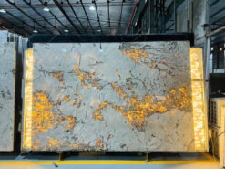 Mẫu đá hoa cương tự nhiên Alabaster khổ lớn có khả năng xuyên sáng tạo hiệu ứng ánh sáng độc đáo. Như hình ảnh minh họa dưới đây, phía sau tấm đá có hệ thống đèn chiếu xuyên sáng tạo hình ảnh đẹp tự nhiên trên bề mặt mẫu đá.