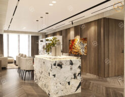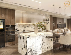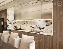 - Đá ốp bếp: Sử dụng mẫu đá hoa cương tự nhiên Alpinus White ốp bếp các vị trí tường bếp, mặt bếp, mặt bàn đảo bếp, mặt bàn ăn,… mang vẻ đẹp độc đáo và ấn tượng với các họa tiết hoa văn nổi bật và mới lạ. Tone màu của mẫu đá này dễ phối hợp với nhiều tone màu sắc khác trong không gian phòng ăn nhà bếp như màu trắng, màu kem, màu gỗ, màu đen,…