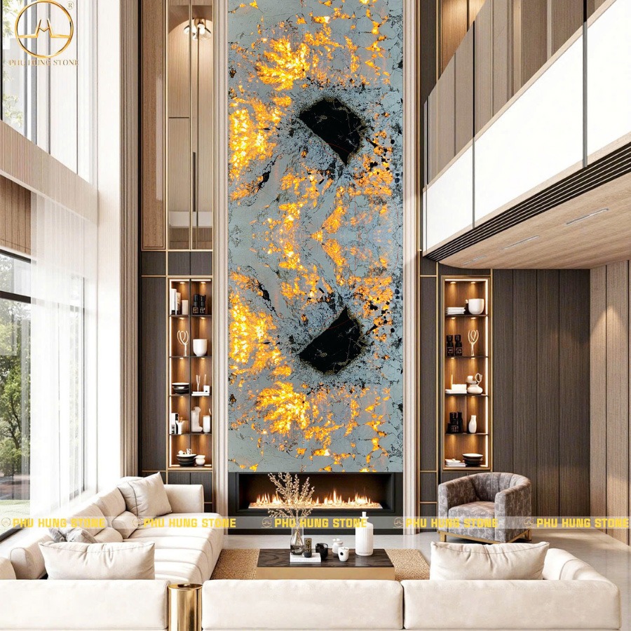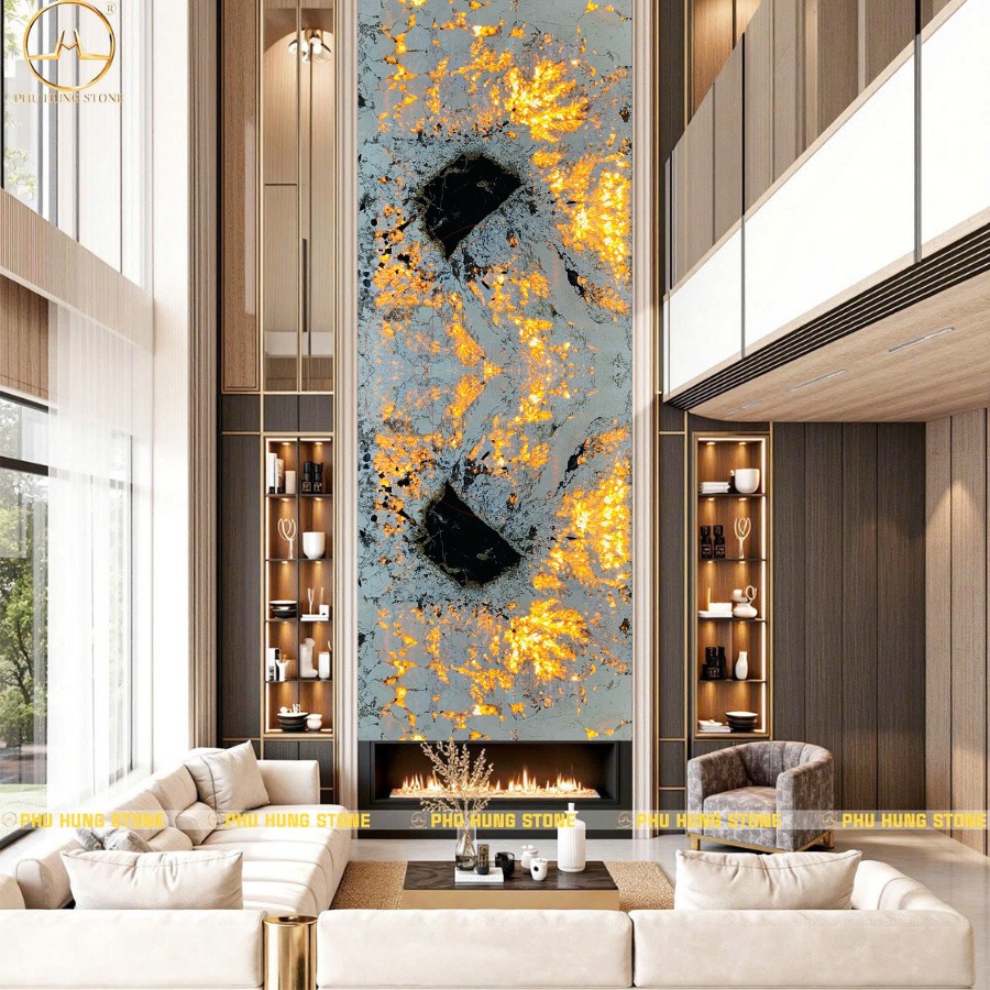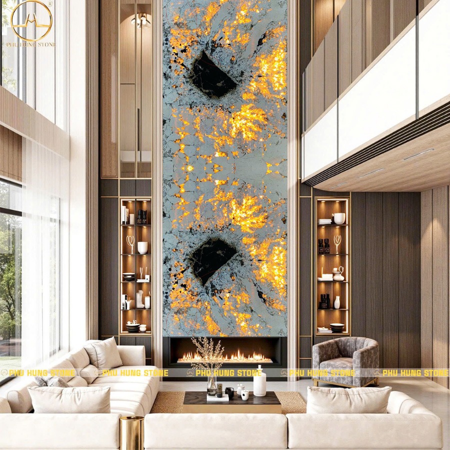 - Khả năng xuyên sáng: Mẫu đá có khả năng xuyên sáng ấn tượng khi được lắp đặt hệ thống đèn LED phía sau tạo hiệu ứng ánh sáng độc đáo và cuốn hút ứng dụng làm tranh đá, vách trang trí, quầy bar,…