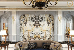 Nếu thay đổi cách sắp xếp 2 tấm đá ghép đối xứng vân sẽ cho ra bức tranh có hình thù, họa tiết hoa văn khác biệt đẹp độc đáo. Khi lựa chọn bức tranh đá đối xứng trang trí phòng khách, bạn có thể chọn ốp tường phía sau ghế sofa hoặc phía sau tivi khu vực vách tivi tạo điểm nhấn tuyệt vời cho không gian nội thất.