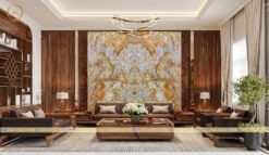 Bức tranh đá đối xứng Jespar Gold được sử dụng để ốp trang trí vách tivi phòng khách – khoảng tường phía sau tivi mang vẻ đẹp ấn tượng cho không gian, khu vực tiếp khách. Bức tranh tone vàng – trắng đan xen tạo điểm nhấn nổi bật cho khu vực tiếp khách, phòng khách gia đình.