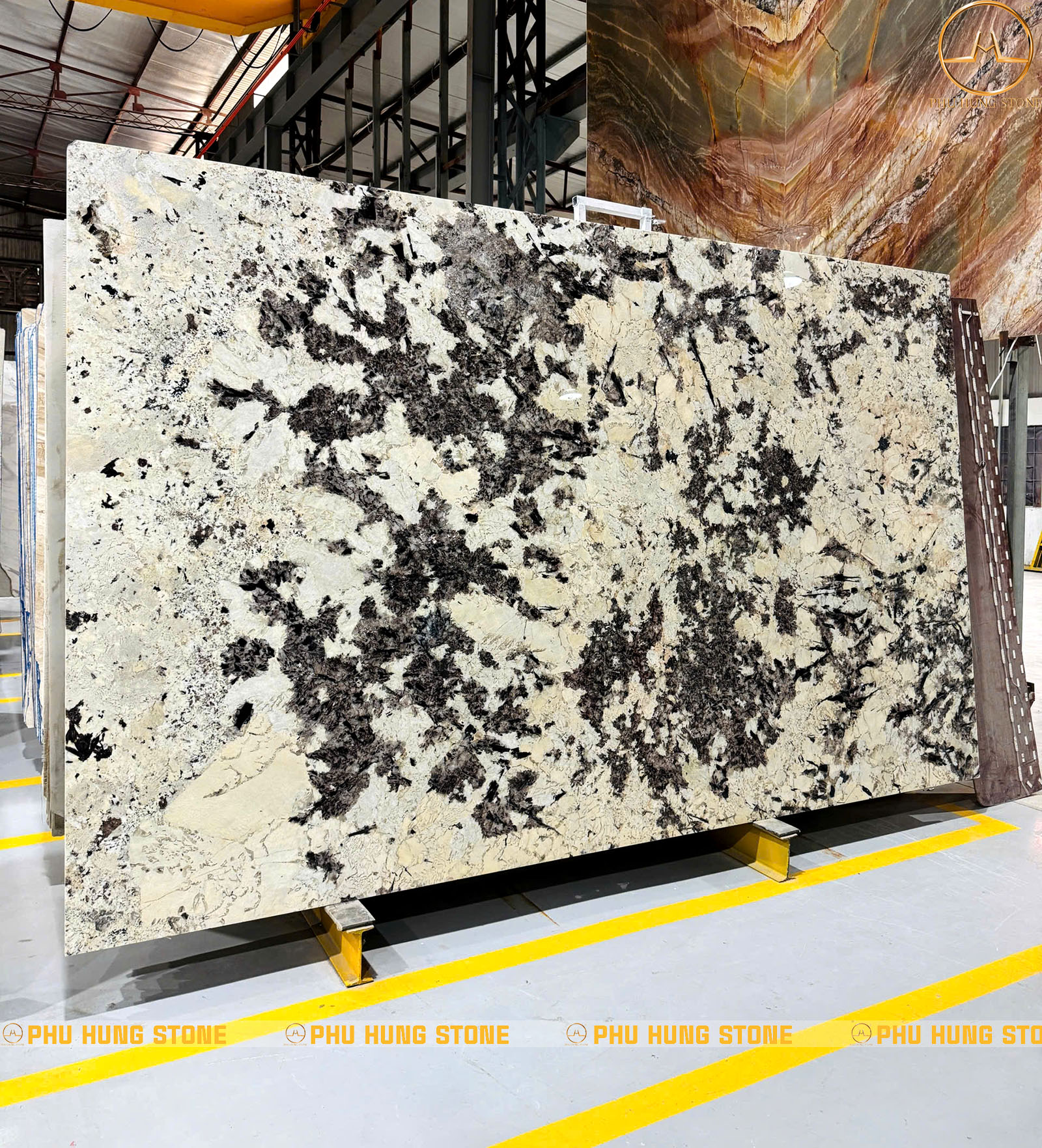 - Vân đá: Hệ vân phân bố dày đặc, mạnh mẽ và phá cách. Các mảng tinh thể lớn đan xen cùng đường khoáng đen tạo nên bố cục giống như: Cánh lông công, vệt khoáng núi lửa, các cụm tinh thể bùng nổ. Mỗi slab gần như là độc bản hoàn toàn.