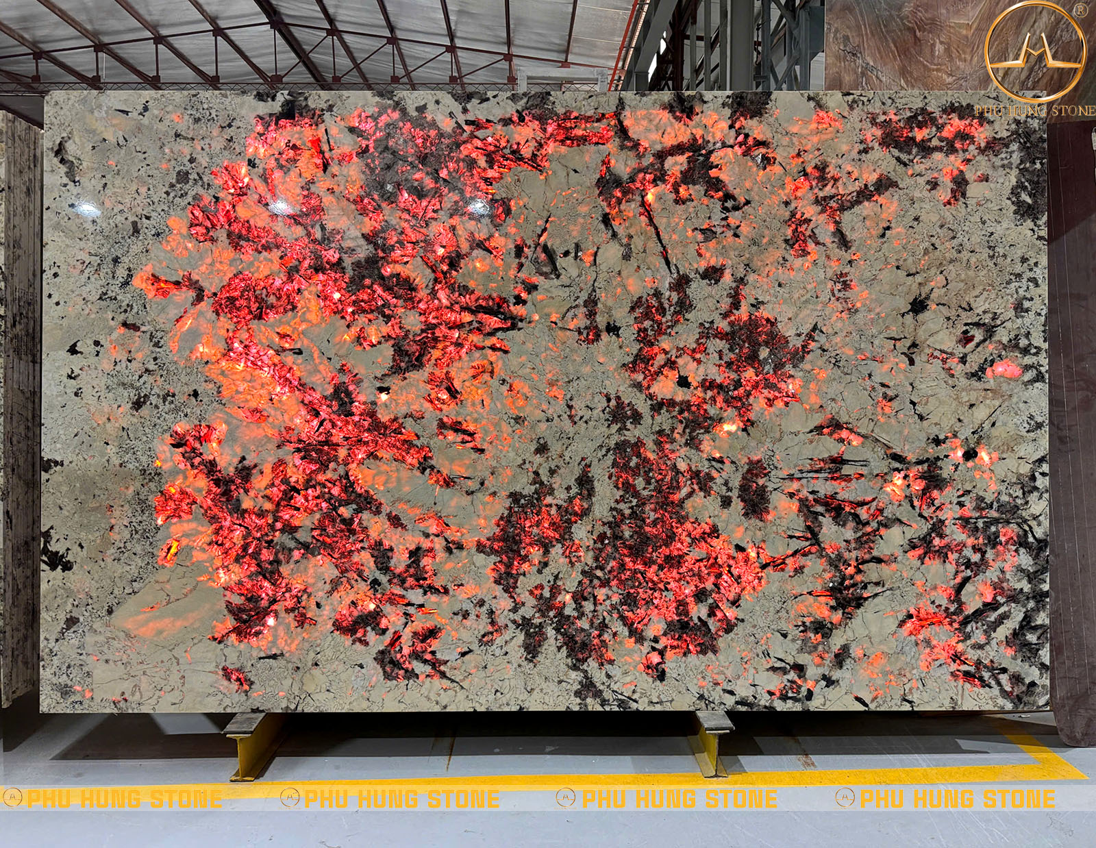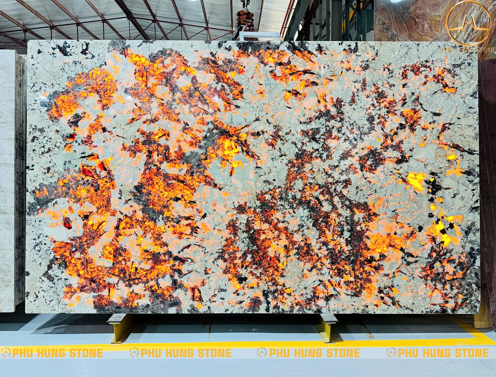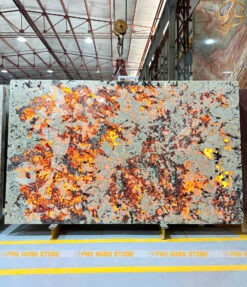- Màu sắc: Khi chưa xuyên sáng mẫu đá có nền trắng kem, đan xen xám bạc và đen khoáng tự nhiên. Khi xuyên sáng tạo nên tone màu vàng cam rực, ánh hổ phách và hiệu ứng lửa nổi bật. Sự tương phản mạnh giữa nền sáng và vùng khoáng phát sáng giúp đá trở thành vật liệu cực kỳ nổi bật.