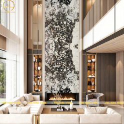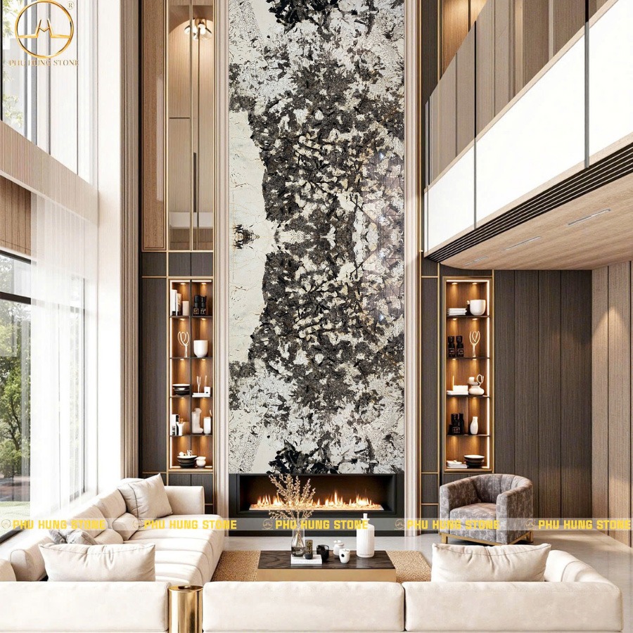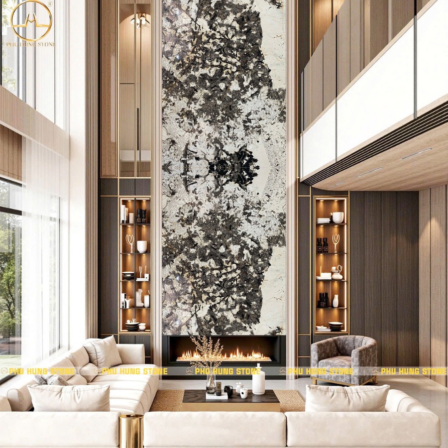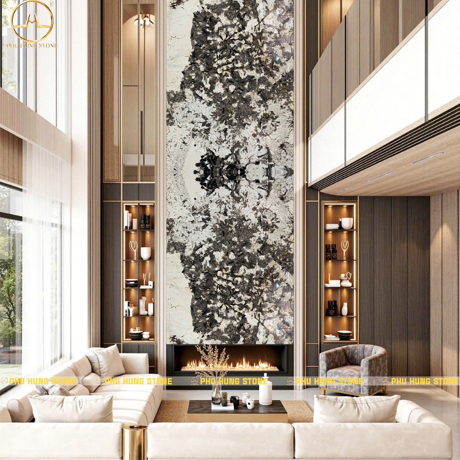 - Màu sắc: Mẫu đá gây ấn tượng mạnh với nền màu trắng ngà tạo cảm giác tươi sáng nhưng vẫn có những mảng màu đen xám tạo chiều sâu tự nhiên và hiệu ứng thị giác mạnh mẽ.