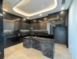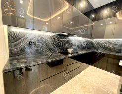 - Đá ốp bếp: Mẫu đá cẩm thạch vân gỗ cổ màu đen huyền bí được ưa chuộng để ốp bếp và làm mặt bàn bếp, bàn đảo mang vẻ đẹp sang trọng và đẳng cấp. Dưới đây là hình ảnh thực tế mẫu đá cẩm thạch màu đen ốp bếp đẹp sang.