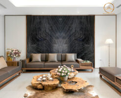 Sự độc đáo của mỗi tấm đá vân gỗ cổ tạo nên điểm nhấn riêng biệt, biến mọi khu vực từ phòng khách, bếp đến phòng tắm thành tác phẩm nghệ thuật.