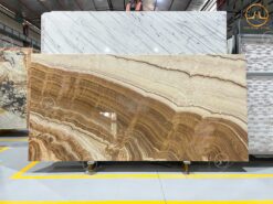 Đá Onyx Nâu Cổ Điển nhập khẩu có màu nâu đậm đặc trưng xen kẽ lớp vân trắng chéo đậm nhạt vô cùng tinh tế.