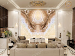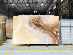 Tranh đá Onyx Vàng Cổ Điển có màu vàng đặc trưng xen kẽ lớp màu nâu vân mây trắng độc đáo.