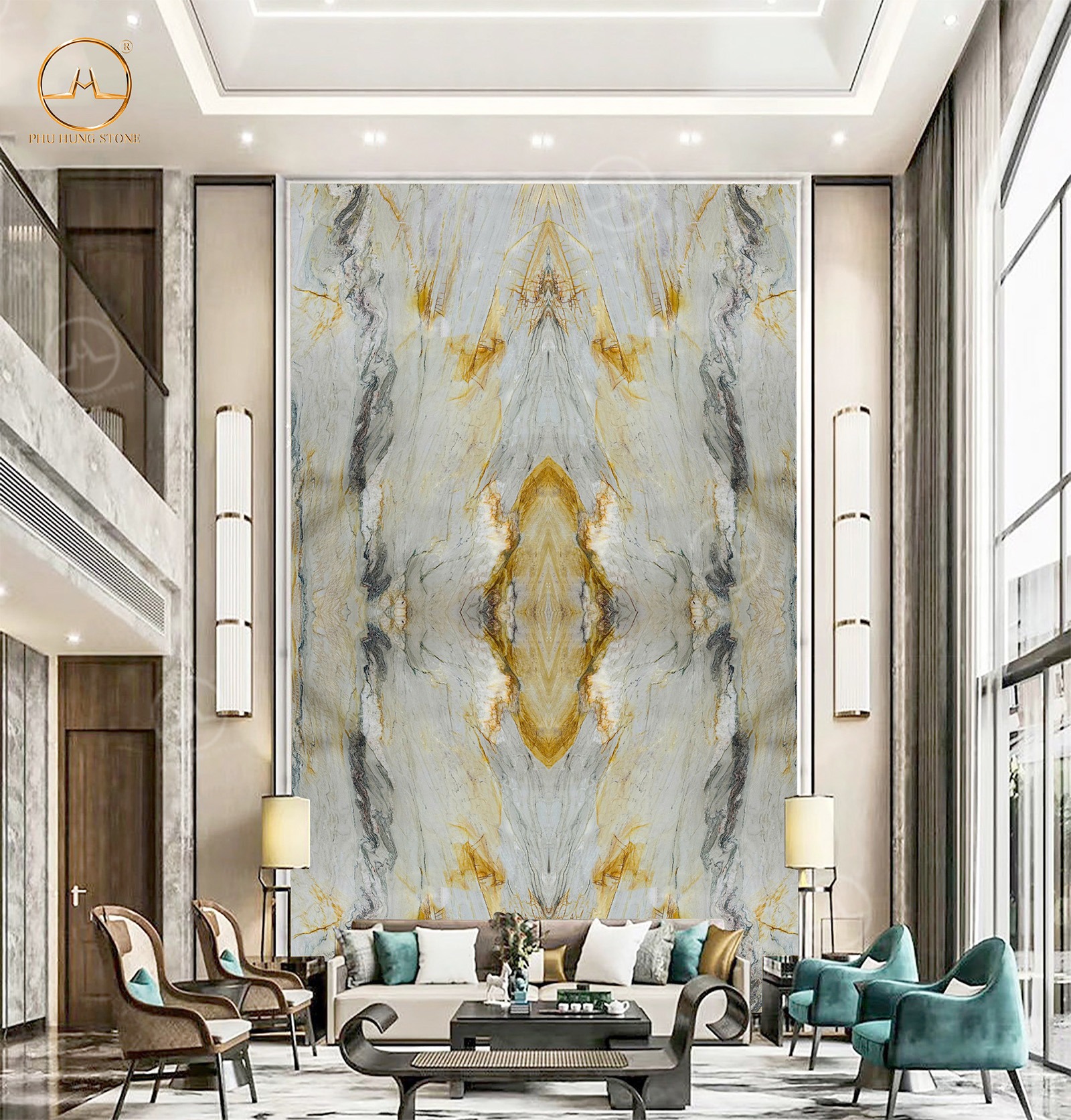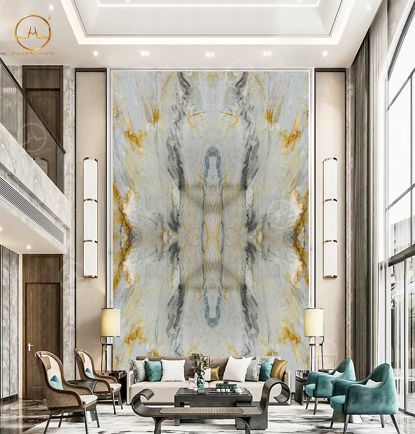 Hoặc sử dụng 4 tấm đá ghép đối xứng theo khổ đứng khổ dọc tạo thành bức tranh thông tầng sử dụng cho các không gian nội thất căn hộ Duplex, biệt thự, penhouse,…. khu vực sảnh khách sạn, nhà hàng cao cấp,….