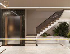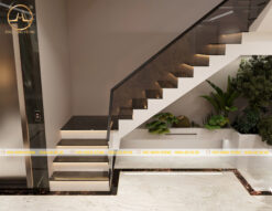 Khu vực cầu thang, thang máy sử dụng đá thạch anh Vibranium để ốp mặt bậc thang, mặt tiền thang máy mang vẻ đẹp hiện đại và sang trọng cho các không gian nội thất cao cấp. Tone màu xám đen ấn tượng vừa là điểm nhấn vừa giúp tạo chiều sâu cũng như vẻ đẹp bóng bẩy, sạch sẽ đến ngôi nhà.