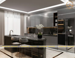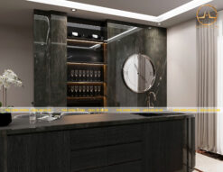 Mẫu đá thạch anh Vibranium được sử dụng để ốp khu vực tủ rượu mang đến vẻ đẹp hiện đại và sang trọng, thể hiện đẳng cấp đến không gian nội thất. Tone màu xám đen ấn tượng giúp cho khu vực để rượu có chiều sâu, lúc nào cũng bóng đẹp sạch sẽ.