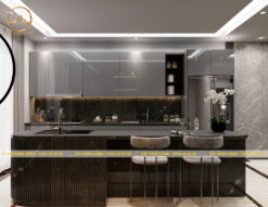 Với tone màu đen xám sang trọng, mẫu đá thạch anh Vibranium được sử dụng để ốp bếp khu vực mặt bếp, tường bếp, mặt bàn đảo bếp đẹp sang trọng và đẳng cấp, tạo chiều sâu cho không gian phòng ăn nhà bếp, đồng thời giúp cho phòng bếp lúc nào cũng bóng đẹp, sạch sẽ.