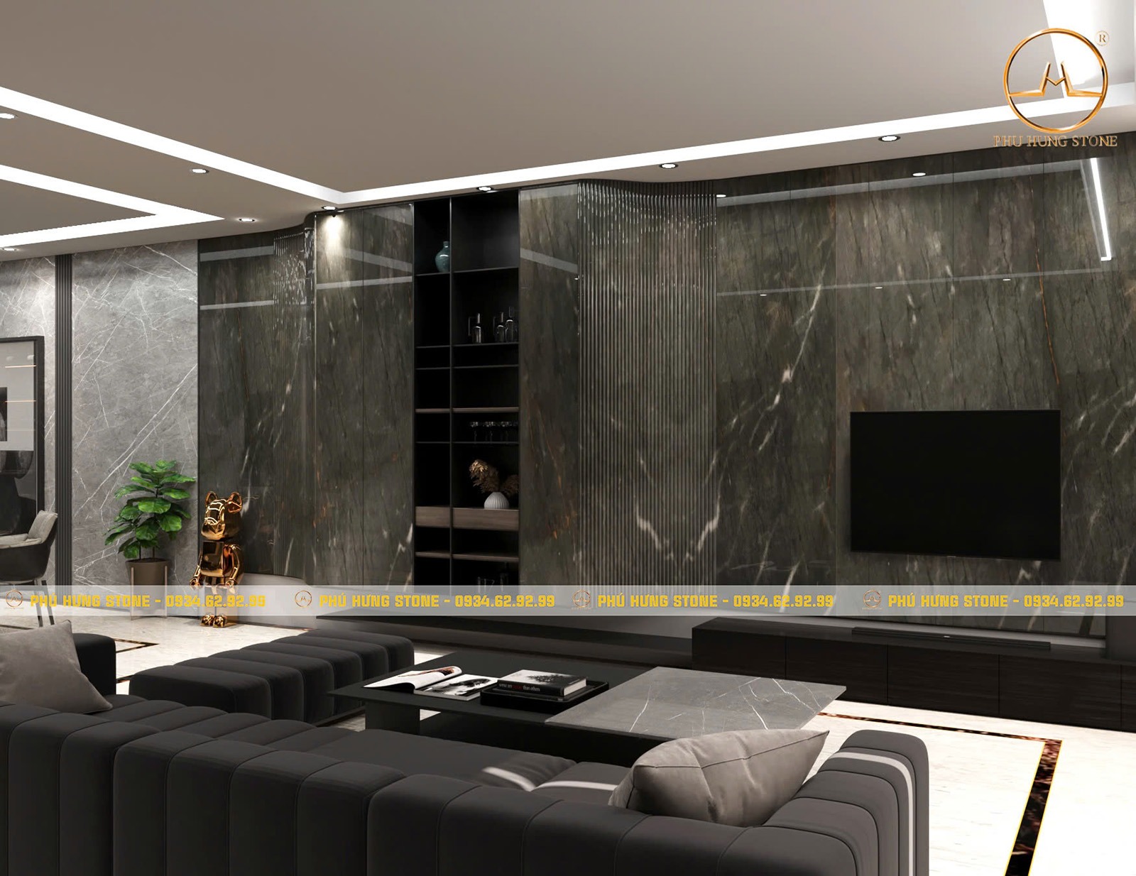 Với các không gian phòng khách, khu vực tiếp khách muốn thể hiện cá tính và gu thẩm mỹ độc đáo của gia chủ thường sử dụng mẫu đá thạch anh Vibranium để ốp tường phòng khách, ốp vách tivi hoặc làm tranh đối xứng. Để nổi bật bức trường ốp đá Vibranium, các nội thất và vật liệu xung quanh sẽ được thiết kế tương đồng hoặc tương phản với tone màu của đá giúp mang đến điểm nhấn ấn tượng.