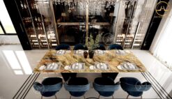 - Mặt bàn ăn sử dụng mẫu đá Quartz Fusion Savage sở hữu vẻ đẹp sang trọng và đẳng cấp, gam màu vàng mang đến cảm giác ấm áp cho không gian phòng ăn nhà bạn.