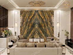 - Tranh đá: Mẫu đá hoa cương Magma Gold với hệ vân độc đáo và tone màu nổi bật được sử dụng để ghép tranh đối xứng vân trang trí không gian phòng khách đẹp, khu vực tiếp khách, sảnh chờ, quầy lễ tân,… Như hình ảnh dưới đây là mẫu tranh đá đối vân Magma gold Ấn Độ được thiết kế 3D đẹp độc đáo và nổi bật: