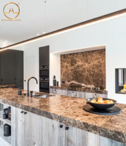 - Đá ốp bếp : Lựa chọn mẫu đá marble nâu đậm cho không gian phòng bếp mang đến vẻ đẹp hiện đại và sang trọng. Mẫu đá có thể sử dụng cho khu vực tường bếp, mặt bếp, bàn ăn, bàn đảo,… có thể phối hợp với các tone màu đen, màu trắng, màu vân gỗ, màu xám,… đều nổi bật và tạo ấn tượng tuyệt vời.