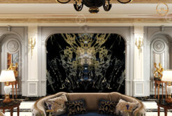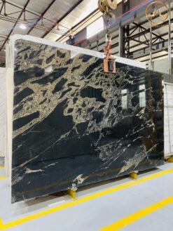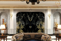 Mẫu đá granite hoa cương tự nhiên với tone màu đen cùng hệ vân màu vàng dạng mạng nhện khi ghép đối xứng vân làm tranh tuyệt đẹp. Mẫu tranh đá Spider Gold được ứng dụng ốp tường, trang trí phòng khách đẹp hiện đại và sang trọng mang vẻ đẹp ấn tượng và độc đáo đến không gian nội thất. Tùy cách sắp xếp 2 tấm đá sẽ cho ra bức tranh có họa tiết hoa văn khác nhau.