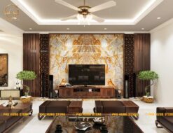 Tranh đá Jespar Gold được ứng dụng để ốp vách tivi phòng khách tạo điểm nhấn nổi bật cho không gian tiếp khách với sắc vàng – trắng nổi bật. Mẫu tranh này dễ phối hợp với nhiều phong cách thiết kế nội thất từ hiện đại cho đến tân cổ điển, cổ điển nên tính ứng dụng được đánh giá cao.