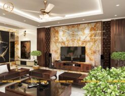 Hình ảnh thiết kế 3D tranh đá Jespar Gold ốp sau sofa