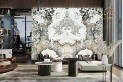 Mẫu 1: Mẫu đá Granite Patagonia này sở hữu tone màu trắng xám nhẹ nhàng cùng hệ vân đen vân xám nổi bật trên nền đá. Đặc biệt, mẫu đá có mảng xuyên sáng lớn tạo điểm nhấn nổi bật khi ứng dụng làm tranh đối xứng 2 tấm hoặc cũng có thể là tranh đơn tấm, tranh thông tầng.