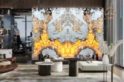 Còn đây là hình ảnh mẫu tranh đá đối vân 2 tấm khi được chiếu đèn xuyên sáng tạo hiệu ứng ánh sáng độc đáo. Bức tranh được tích hợp hệ thống đèn LED ở phía sau để chiếu sáng, ánh sang sẽ đi xuyên qua bề mặt tấm đá để tạo nên vùng sáng tự nhiên trên mặt bức tranh mà không vật liệu trang trí nào có thể làm được.