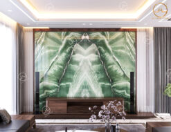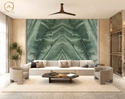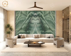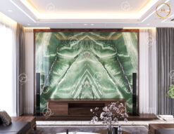Mẫu đá quartz thạch anh Tropical có thể ghép thành tranh đối xứng vân từ 2 tấm slab đá tạo hình thù và họa tiết hoa văn độc đáo ứng dụng làm tranh đá trang trí đẹp cho nhiều không gian nội thất. Mỗi cách ghép đối vân từ 2 tấm đá lại cho ra những hình thù khác nhau, tùy theo sự lựa chọn của khách hàng. Dưới đây là một số hình ảnh thiết kế 3D tranh đá màu xanh lá Tropical ốp vách tivi và phía sau ghế sofa.