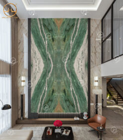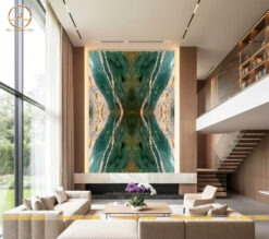 Tranh thông tầng 2 tấm Fuchsite Crytal được ghép đối xứng vân 2 tấm theo khổ dọc tạo thành bức tranh thông tầng có tổng kích thước khoảng 1m9x6m trang trí cho những không gian thông tầng cao cấp căn hộ Duplex, biệt thự, sảnh khách sạn nhà hàng,…