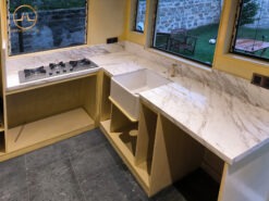 - Đá ốp bếp, mặt bàn ăn, bàn đảo bếp: Lựa chọn đá marble Volakas màu trắng mang đến vẻ đẹp hiện đại, tinh tế và cảm giác thông thoáng, rộng rãi, sáng sủa cho không gian phòng ăn nhà bếp.