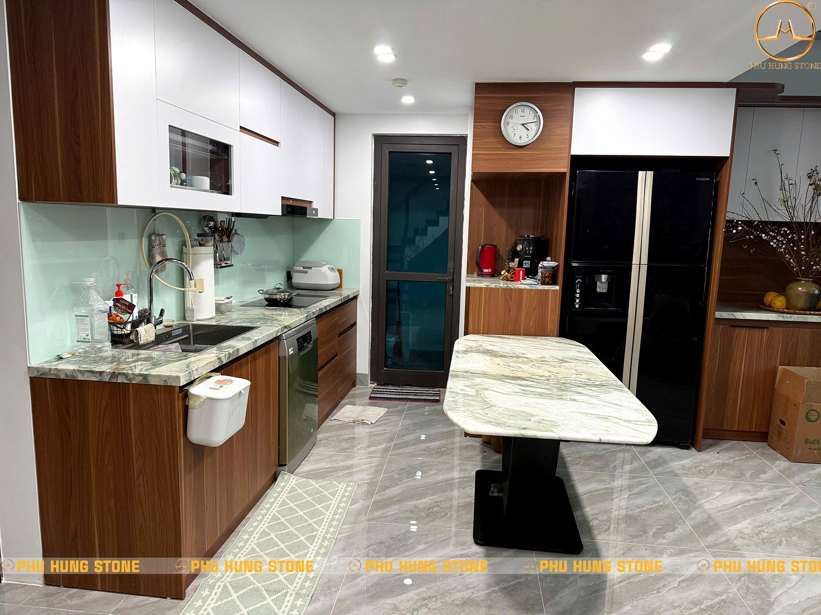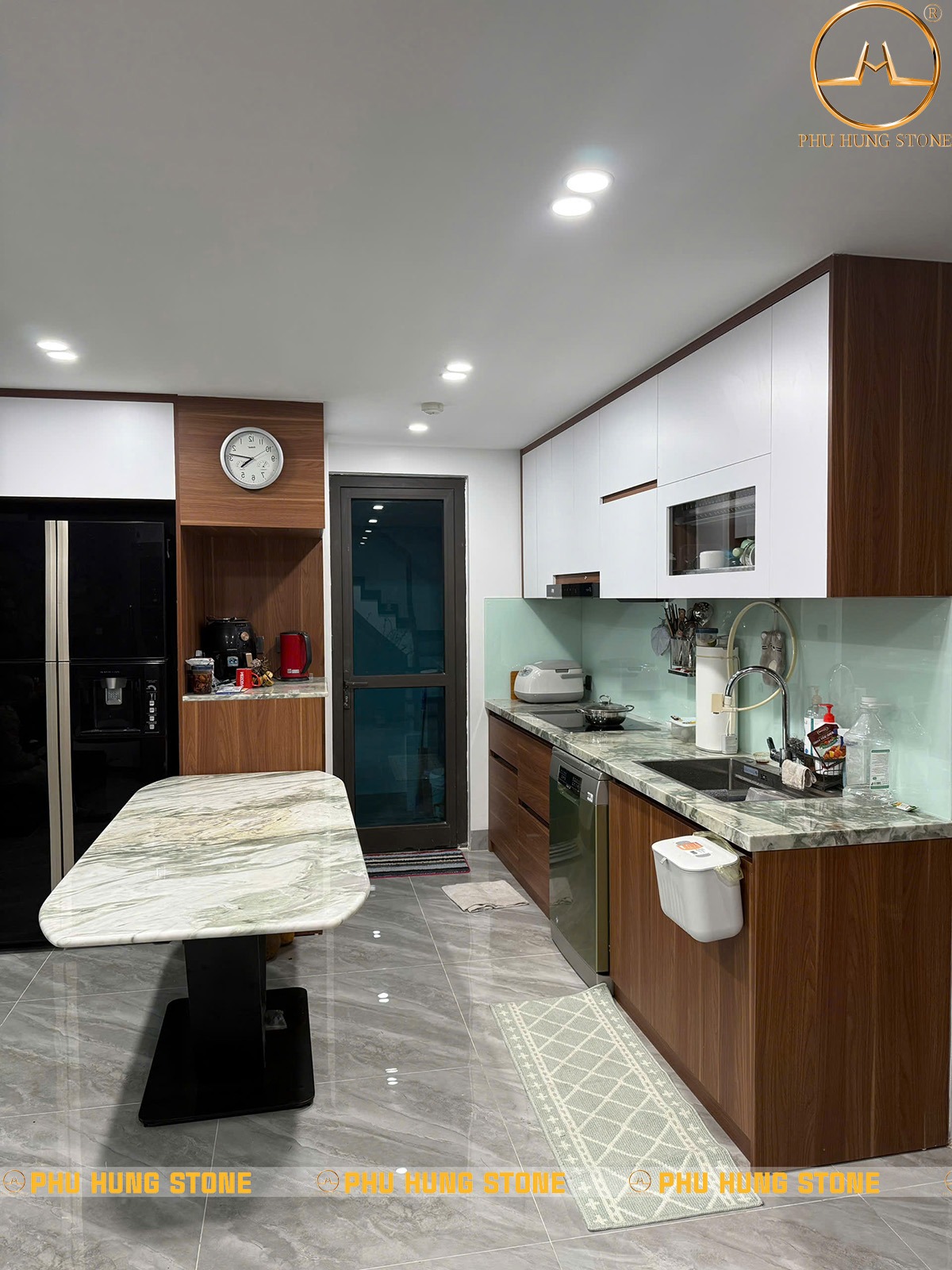 Thi công đá ốp bếp và mặt bàn ăn được đánh giá là hạng mục quan trọng trong việc hoàn thiện nội thất, ảnh hưởng trực tiếp đến thẩm mỹ, công năng sử dụng và giá trị lâu dài của không gian phòng ăn nhà bếp. Tại Công trình KĐT Việt Hưng, Phú Hưng Stone đã được gia chủ tin tưởng lựa chọn cung cấp và thi công đá tự nhiên cho khu vực bếp và bàn ăn, mang đến tổng thể sang trọng, hiện đại và bền vững theo thời gian.